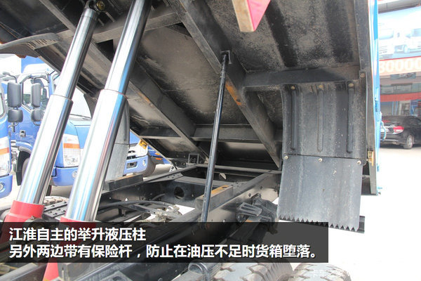 该车使用的是江淮自主的举升液压柱,另外两边带有可撑起保险杆,防止在油压不足时货箱堕落。此外采用了幅面高度为24mm的双层大梁,可以看得出该车在承载力方面还是不错的。