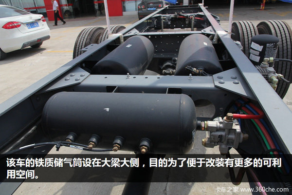 该车的铁质储气筒设在大梁内侧,目的为了便于改装有更多的可利用空间。其中,大梁幅面高度为270mm,标准承载出色。