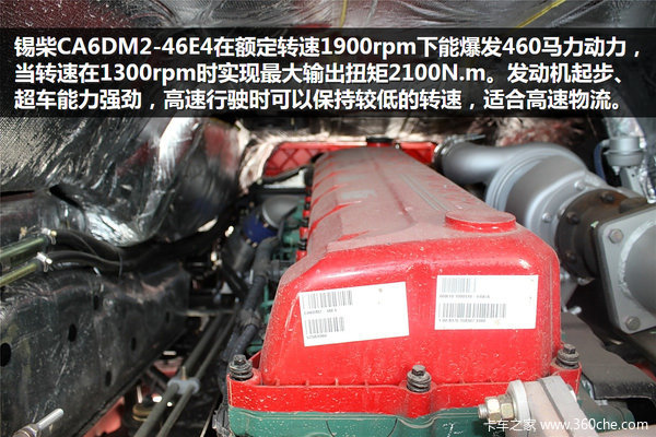 锡柴CA6DM2-46E4最大输出功率为460马力,当发动机在1100-1400rpm下实现最大输出扭矩2100N.m。当车辆行驶在干线平路、驱动力足够、挂车匹配好的情况下,车速在75-85之间,驱起步、超车能力强劲,高速行驶时可以保持较低的发动机转速,更加适合追求速度的高效物流运输。另外锡柴奥威发动机标配FCB固链式制动系统,提高行车安全,减少刹车使用。