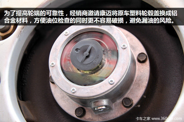 为了保证轮端的可靠性,康迈将原车塑料轮毂盖换成铝合金材料,方便油位检查的同时更不容易破损,避免漏油的风险。