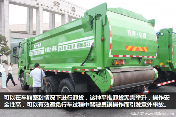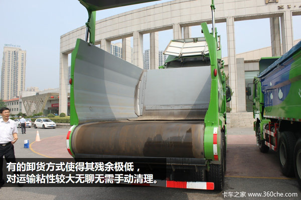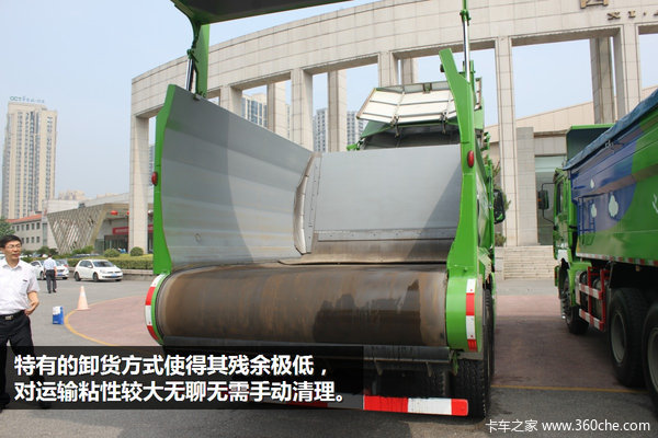 不同于常规自卸车的举升设计理念,此款车型可以在车厢密封情况下进行卸货,这种平推卸货无需举升,操作安全性高,可以有效避免行车过程中驾驶员误操作而引发意外事故。