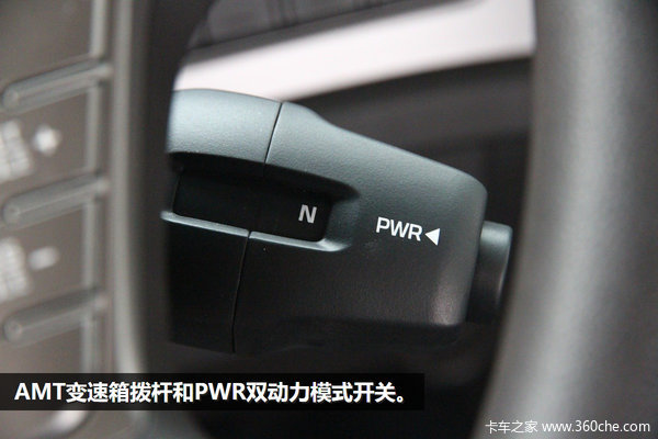 与传统车型大有不同的是,这款车型采用采埃孚(ZF 12AS2540 TO)12档自动变速箱,AMT操作手柄在方向盘右侧下方,可DM,D,N,R,RM五种模式选择,其中还囊括了PWR双动力模式开关。DM档位类似于爬坡模式,以限制较低的速度获得较大的动能,RM模式同理。