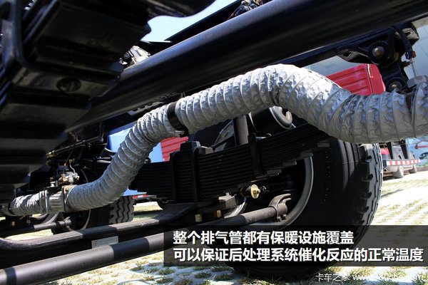 欧曼京五车型从外观上来看,与国四车型的最大区别就是其整个排气管都有保暖设施覆盖,是为了保证后处理系统中催化反应的正常温度,从而提高尾气的催化转换效率。