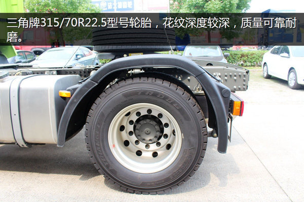 此车配备了三角牌315/70R22.5型号轮胎,花纹深度较深,质量可靠耐磨,满足长干线运输需求。
