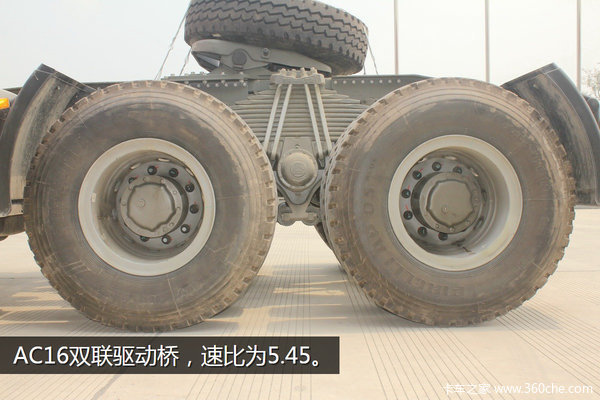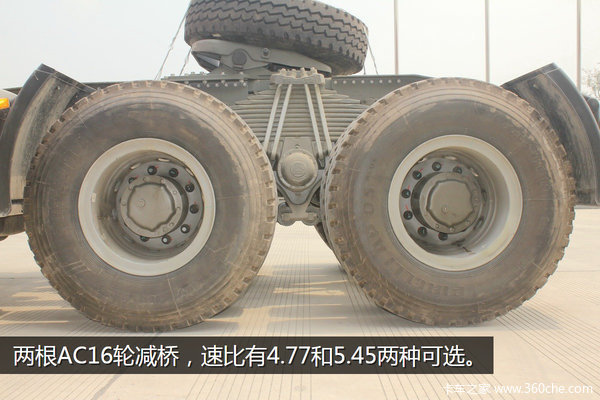 暴力的发动机加上斜齿变速箱,如果不配上两根给力的后桥,都不能称之为大件车。此款车型装配的后桥为重汽的AC16后桥,后桥速比有4.77和5.45两个速比可选,带有轮间差速锁和轴间差速锁。