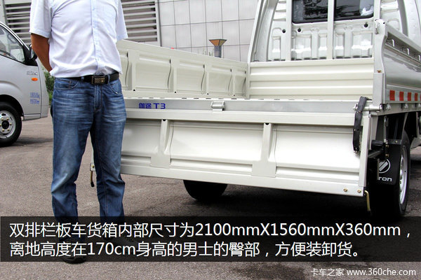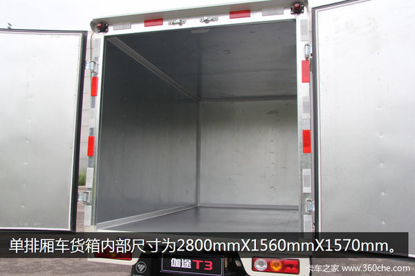 该款车分为单排厢车和双排栏板车型,货箱内部尺寸分别为2800mmX1560mmX1570mm和2100mmX1560mmX360mm。车身安全性方面,伽途T3采用了欧洲安全标准设计,具备独有的两级防撞吸能区,最大限度的保证驾乘人员的安全
