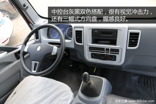 外观方面依然采用显得非常吉庆的大红色,前进气格栅配上黑色粗条,霸气而不失稳重。驾驶室为宽体设计,可以乘坐三人。