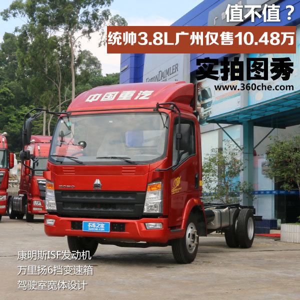 来卡车之家App【卡车之家 原创】中国重汽虽然是轻卡市场一支新秀,但自去年发布其轻卡车型“悍将”和“统帅”之后,受到了很多用户的关注,其产品也在不断完善。在HOWO统帅的2.8L排量车型占据主流市场之后,还有一部分用户也在关注着它的另一个排量车型,那就是小编今天在广州市广物林机汽车销售服务有限公司了解到的3.8L排量车型,它的售价是10.48万元。