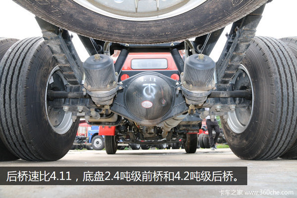 该车型使用板簧较多为前11后11+7。前、后桥均采用鼓式制动器,后桥速比4.11,底盘2.4吨级前桥和4.2吨级后桥。