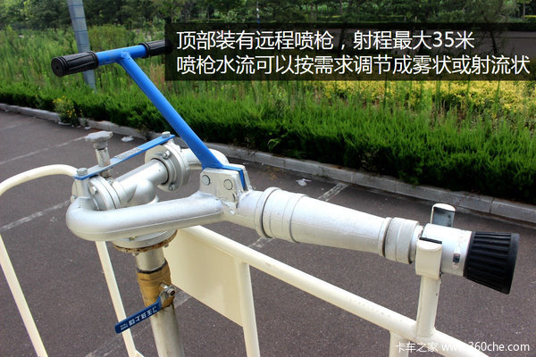 车辆尾部的上方装有远程喷枪,射程最大35米。喷枪水流可以调节成雾状或射流状,满足不同的需求。功能齐全,一车多用,可以消防灌溉,也可以绿化喷洒和清洗广告牌和楼房的外立面。