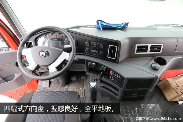 这款390马力车型用的是高顶全浮加长驾驶室,选用了非常吉庆的红色涂装。