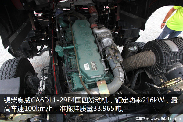 来卡车之家App锡柴奥威CA6DL1-29E4发动机,输出马力290匹,最大扭矩1150N.m,发动机转速在1300-1700rpm的范围时达到最大扭矩,车辆最高时速100km/h。