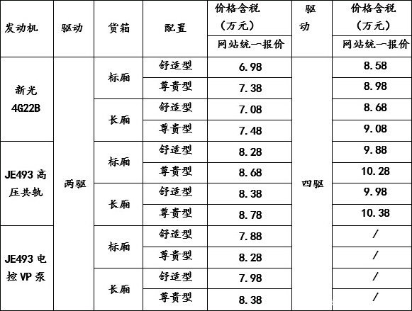 | 新光4G22B | 两驱 | 标厢 | 舒适型 | 6.98 | 四驱 | 8.58 |