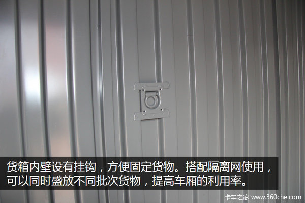 货箱内壁设有挂钩,方便在内部固定货物。另外如果搭配隔离网使用,可以将货箱分为几个小区间,可以同时盛放不同批次货物,提高车厢的利用率。