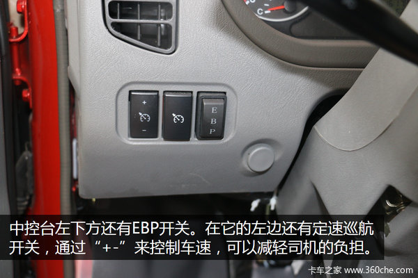 显示屏左下方还有EBP开关,E是经济节油方式,B是标准状况,P是重载状况。在EBP开关左边还有定速巡航开关,通过“+—”来设定车速,在高速公路行驶时可以一定程度上减轻司机的负担。