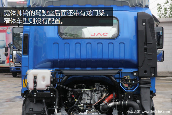 从外形来看,这款宽体的帅铃和窄体的车型相比,除了驾驶室宽度不一样外,最大的区别就在于后视镜的不同了,它的后视镜换成了新的框架式结构,并且在驾驶室左侧增加了一个广角镜,减少了司机的盲区。其他的地方并没有明显的标识来区分。此外宽体帅铃的驾驶室后面还带有龙门架,窄体车型则没有配置。