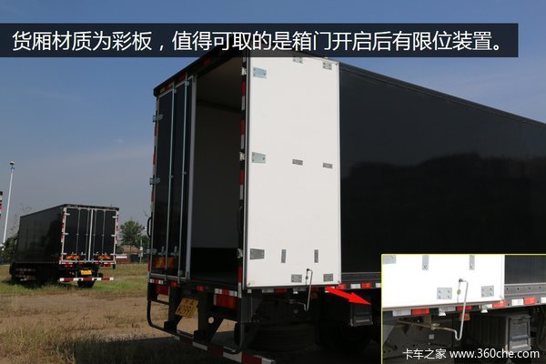 整个货箱的内径尺寸为:9600*2400*2570mm。货厢材质为玻璃钢,做工结实。值得一提的是箱门开启后有限位装置。