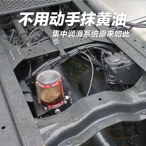 其实集中润滑系统并不神秘,最简单的说法就是一个压润滑油的机器再加上数根油管就可以了,依维柯Stralis Hi-Way 500马力 6X2 牵引车车型装配的集中润滑系统放置在大梁的内侧,既能保护润滑脂容器和压油装置,也能缩短各个部件和容器之间的距离。