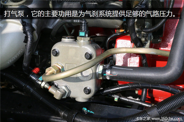 这款车的行车制动方式为气刹,发动机上装有空压机就是我们常说的打气泵,它的功用主要是为气刹系统提供足够的气路压力,以保证气刹系统的安全可靠。