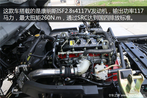 这款车搭载的是康明斯ISF2.8s4117V发动机,输出功率117马力,当转速在1300-3200的区间内时,达到最大扭矩260N.m,通过SRC达到国四排放标准。