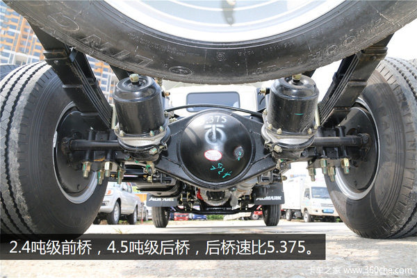 这款车在承载方面采用2.4吨级前桥,4.5吨级后桥,后桥速比5.375。前桥为少片簧设计3+1,后桥为多片簧设计6+7。