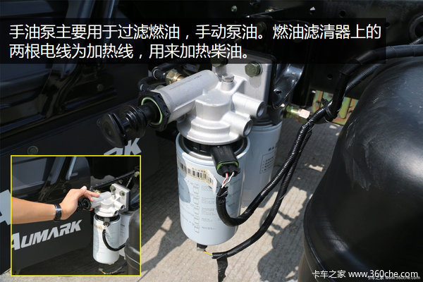 该车采用双级油滤,手油泵装在油滤上。手油泵主要用于手动泵油。燃油滤清器上的两根电线为加热线,用来加热柴油。