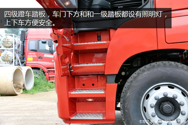 由于是平地板车型,驾驶室采用4级蹬车梯的方式,其中上面两级蹬车梯被车门包裹,减少风阻,看起来更加的美观。