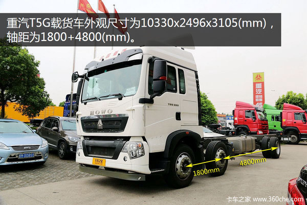 重汽T5G载货车底盘的外观尺寸为103300x2496x3105(mm),轴距为1800+4800(mm)。该车的整车重量为8.8吨,额定载重11.17吨,可以充分满足中短途城际运输需求。