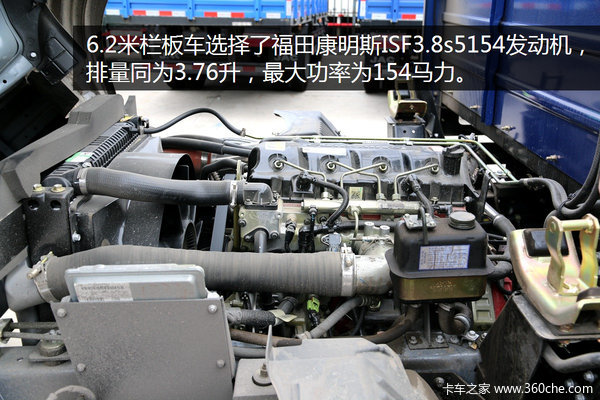 另一款6.2米栏板车选择了福田康明斯ISF3.8s5154发动机,排量同为3.8升,最大功率为154马力,在1200-1900rpm的转速区间内可输出500Nm的扭矩。搭配六安LC6T51变速箱,换挡顺畅,这样的扭矩在长途爬缓坡也不会太费劲。6.2米栏板车的轮胎8.25R20型号轮胎,大轮胎承载力更强,适合长途拉重货。