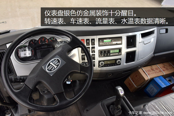 仪表盘银色仿金属装饰十分醒目。转速表、车速表、流量表、水温表数据清晰,精度提高。针对东北地区低温天气,配备除霜功能,整车标配自动空调。