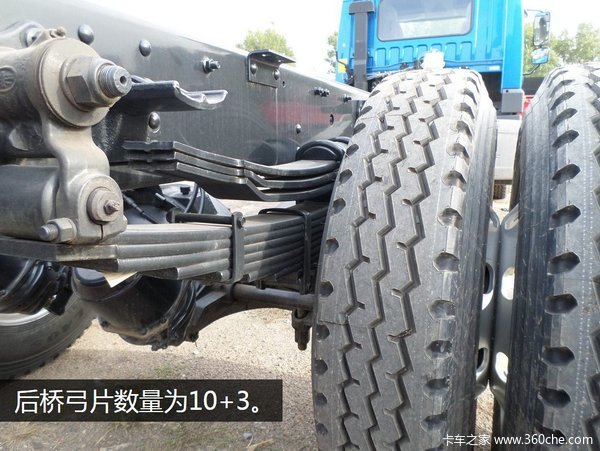 底盘为237*75*7的单层车架,可以看出车架的表面是有光泽的,这就是青岛解放引以为傲的底盘整体二次喷漆技术,相较于涂蜡的工艺防耐腐蚀性更好,而且不易脱落。目前在国内属于较为先进的底盘处理技术。