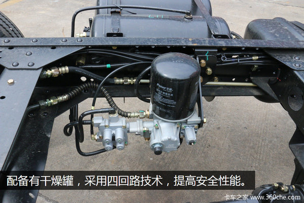 配备有空气干燥罐,采用四回路技术。不过该车干燥罐设在大梁内侧,当货厢装上后可能对维修可能就有些不太方便了。