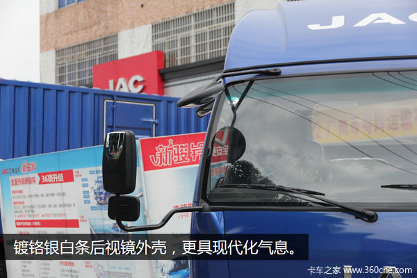 这款江淮骏铃轻卡采用宽度为1995mm驾驶室,造型方面看起来比较简洁。上下后视镜组合视野更宽方便司机倒车,后视镜外壳还加入了新颖的色彩,带有鲜明的现代特色。