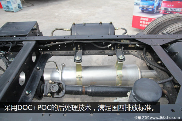 骏铃采用了型号为JND408D160-47的迈斯福发动机,排量为3.185L,输出功率为160马力,最大输出功率88KW,最大扭矩转速1200-1600rpm。结合DOC+POC的后处理技术,满足国四排放需求。