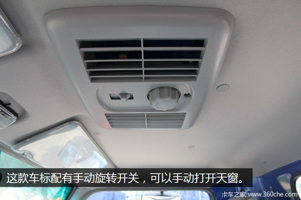 驾驶室里使用的是手动旋转开关天窗,在炎热的天气中停放较长时间后,要想尽快将车中的热气排出车外,这时除了开空调外,打开天窗和车窗是个极佳的方法,由于热气往上走,天窗对热气散去更有利。