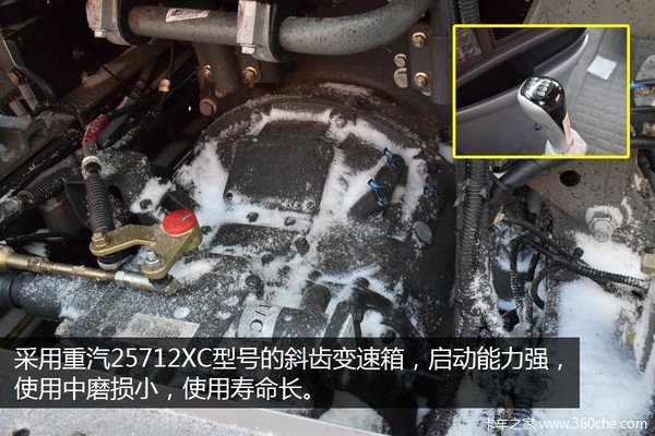这款车上的变速箱采用重汽自主生产的HW25712XC变速箱,是重汽经过重新设计的斜齿变速箱。这款变速箱启动能力强,使用中磨损小,使用寿命长。