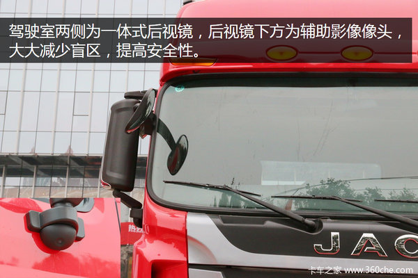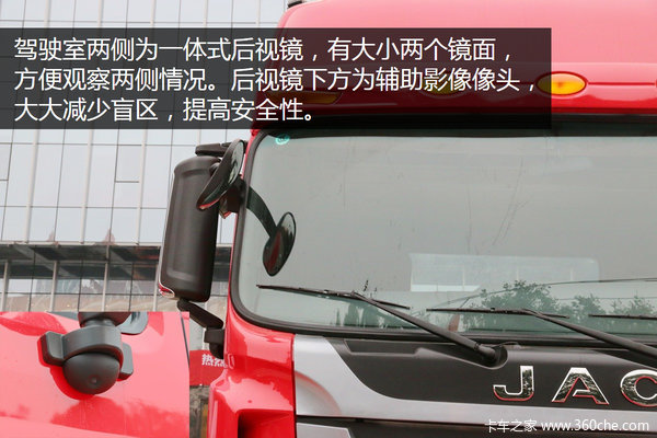 驾驶室两侧为一体式后视镜,大小两个镜面,方便司机观察两侧情况。同时在后视镜下方为辅助影像摄像头,更好的呈现左右路况,大大减少盲区,提高安全性。