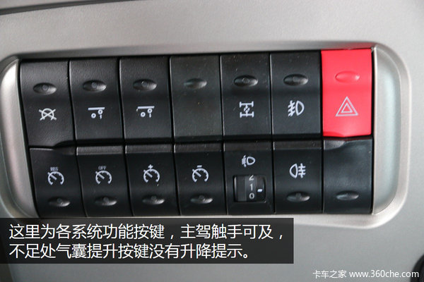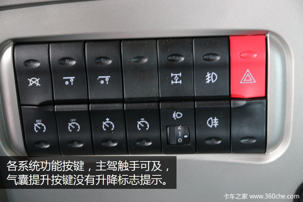 中控左侧为各个系统控制按键,气囊提升按键、轴间差速锁、大灯高度调节等按键,在主驾位上触手可及。