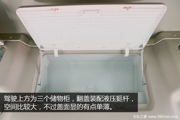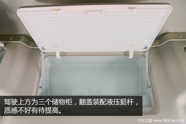 驾驶上方为三个储物格,掀盖装配液压挺杆,三个储物格内部空间大,但材质显得有点单薄。