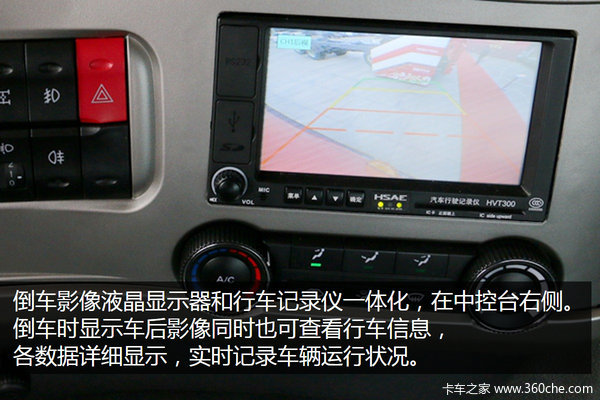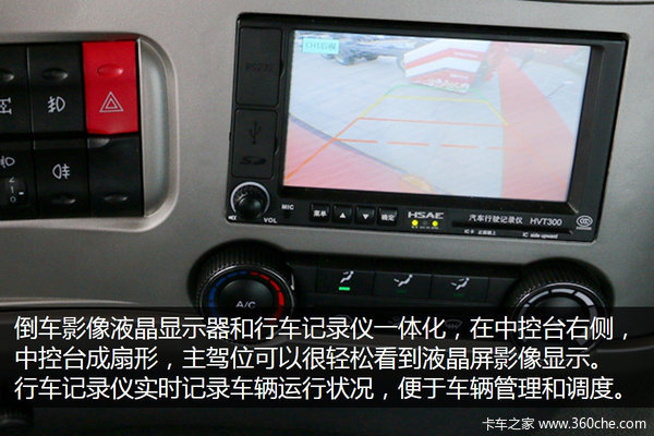 倒车及辅助影像液晶显示器和行车记录仪一体化,位于中控台右侧,显示屏尺寸大,影像清晰,中控台成扇形状,主驾位可以很轻松看到液晶影像显示。行车记录仪实时记录车辆运行状况,便于车辆管理和调度。