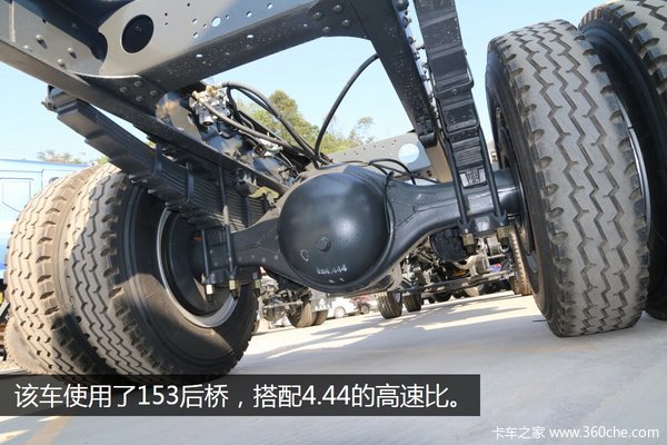 这款随吊专用底盘车的大梁与普通的车型大梁不一样,其大梁采用了双层局部三层加强型大梁。153后桥搭配4.44的速比,载重潜力更强。