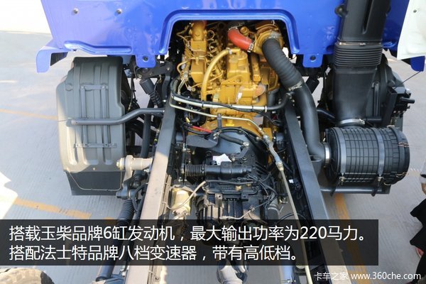 该车搭载的玉柴品牌6缸发动机,型号为YC6J220,最大输出功率为220马力,金黄色的涂装让它被誉为“黄金心脏”。其搭配了法士特品牌八档变速器,带高低档,使用395型离合。变速箱装有PTO取力器,方便日后车辆上装改造。