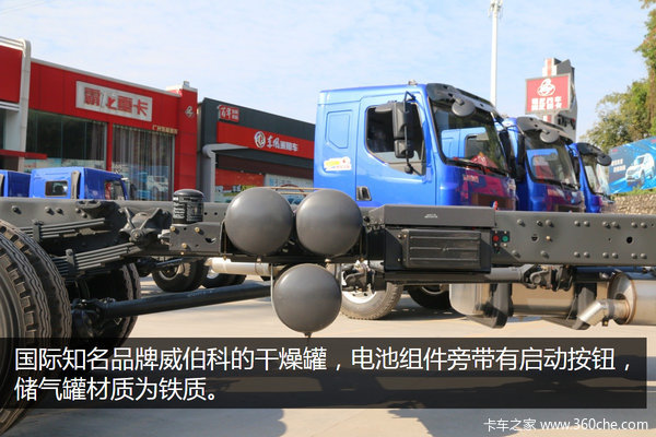 这款车左侧配置有350升的铝合金油箱、35升的尿素箱及油水分离器,并且油水分离器带有手油泵。右侧配置了威伯科品牌的干燥罐和材质为铁质的储气罐,电池组件旁带有启动开关按钮。