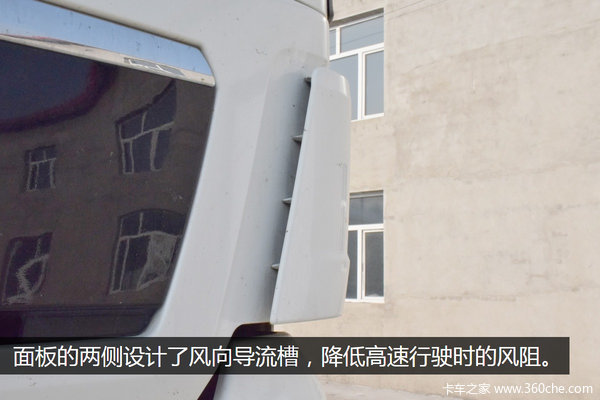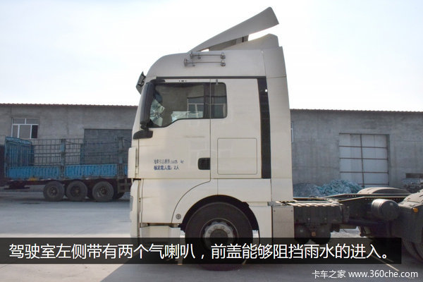 驾驶室左侧带有两个气喇叭,前盖能够阻挡雨水的进入,不锈钢的材质起到了很好的点缀作用。
