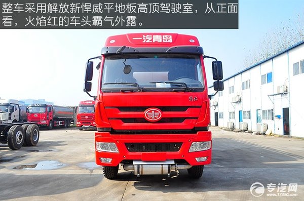 整车采用解放新悍威平地板高顶驾驶室,从正面看,火焰红的车头霸气外露,既显稳重大气又添现代时尚感。
