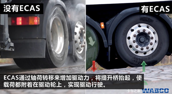 目前国内9气囊结构的车型都为6X2驱动模式,传统的6X2驱动的车型在湿滑路面或者是冰雪路面的时候会出现驱动力不足的情况,而9气囊的汕德卡C7H的ECAS系统具有轴荷转移功能,可以提高驱动力。(上面那段视频可以看出轴荷转移功能的作用)