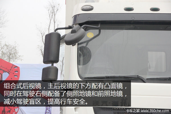 组合式后视镜,主后视镜的下方增加了补盲镜给司机提供更好视野。同时在驾驶右侧配备了侧照地镜和前照地镜,减小驾驶盲区,提高行车安全。