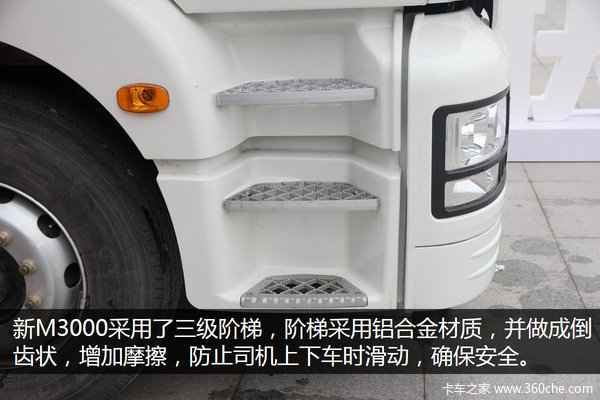 新M3000采用了三级阶梯,上下车更加方便。阶梯采用铝合金材质,并做成倒齿状,增加摩擦,防止司机上下车时滑倒,确保安全。下面两侧阶梯宽度比较窄,上下车容易踩到光滑边框上。