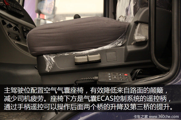 主驾驶位配置空气气囊座椅,可以有效降低行驶中来自路面的颠簸,减少司机疲劳,同时座位可以多放调节,提高舒适性。座椅下方是后桥气囊ECAS控制系统的遥控手柄,可以遥控操作整车高度,方便装卸货物。
