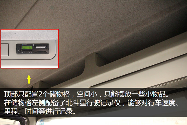 顶部只配置2个储物格,空间小,只能摆放一些小物品。在储物格左侧配备了北斗星行驶记录仪,能够对行车速度、里程、时间等进行记录。